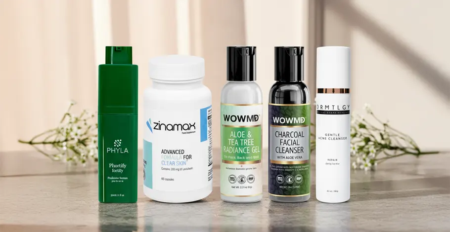 WOWMD Aloe & Tea Tree Radiance Gel | DRMTLGY Gentle Acne Cleanser | Zinamax Advance Formula | Phyla Acne-fighting Probiotic Serum | |