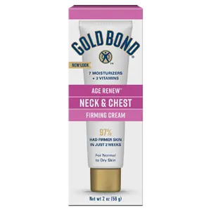 - Improved Skin Firmness: Gold Bond Age Renew enhances the firmness of the neck and chest skin, helping to restore a more youthful contour.